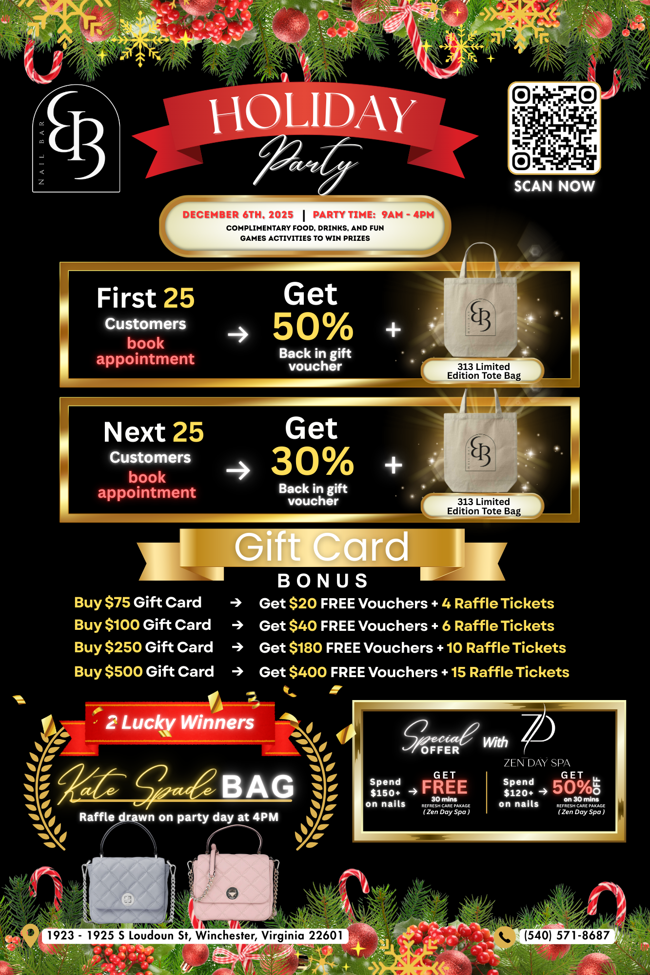 This is the form for you to fill out to receive our Holiday Party. After filling out we will redirect you to our online booking page. Please book an appointment from there. We might need to call to confirm. Valid only for appointments from Now - December 6th, 2025.